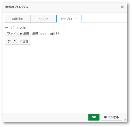 ・ファイルを選択をクリックして任意のファイルを選択したら、その下のボタンのサーバーに送信をクリックしてOKをクリックすれば画像を貼り付けることができます。画像情報のタブで画像の大きさなども変更できますが、必要がない場合はサーバーに送信をクリックした後にOKボタンをクリックしてください。